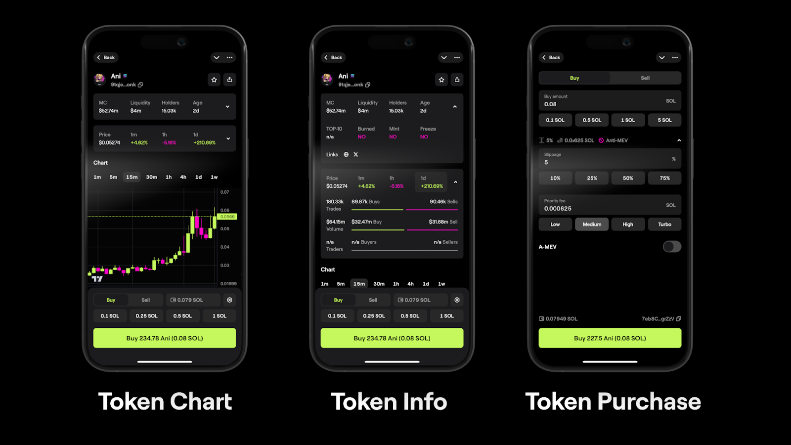 You can trade from any screen by pasting a token address, ticker, or shared link. Blum immediately fetches the token’s page with: