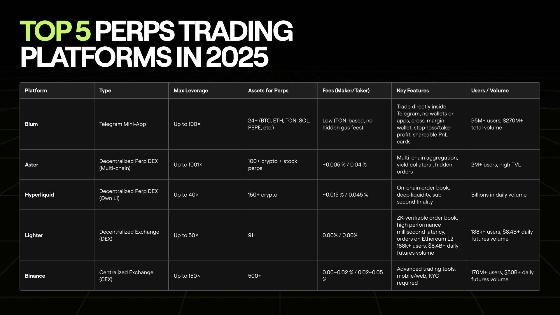 In this article, we’ll compare five of the top platforms: Blum, Aster, Hyperliquid, Binance, and Lighter. You’ll see how they differ in fees, leverage, and usability — and why Blum’s Telegram-first approach is opening the door to millions of new traders.